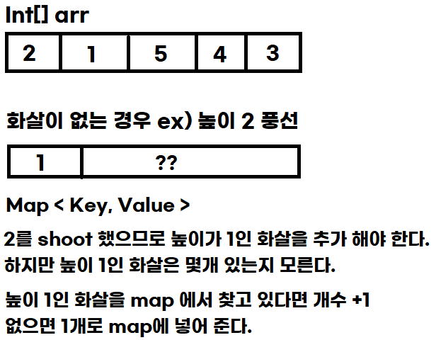 배열을 1번만 돌며 해당 풍선의 높이의 화살이 없으면 Map에 넣어줍니다.
