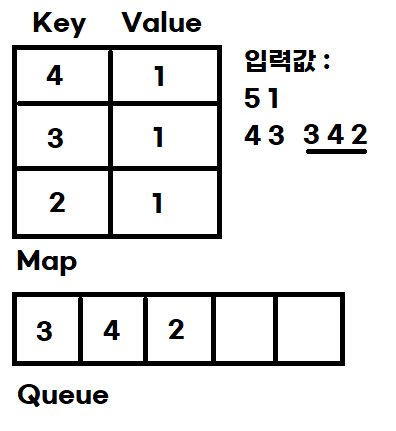 3의 개수가 2개가 되므로 큐에서 3이 나올때 까지 poll() 하며 Map을 업데이트 합니다.