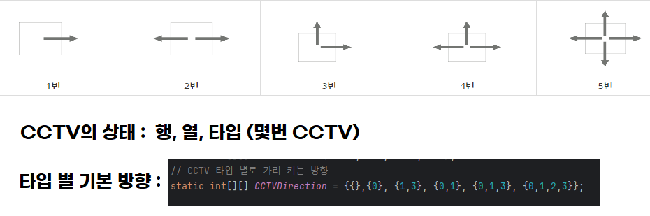 static int[][] CCTVDirection = {{},{0}, {1,3}, {0,1}, {0,1,3}, {0,1,2,3}};