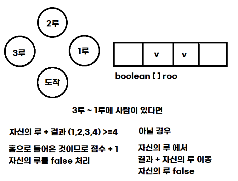 만약 홈런일 경우 점수 +1 / 아닐 경우 해당 루에 true 처리 하면 됩니다.