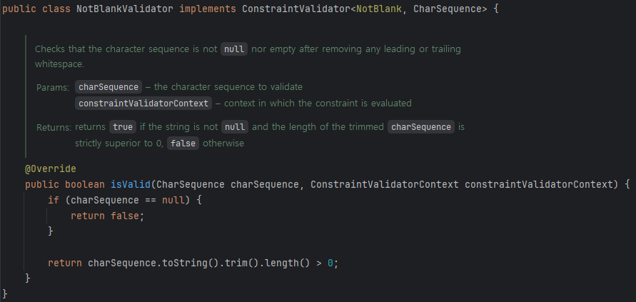 값이 null 아니고, 공백을 제거한 길이가 0 보다 크다면 검증에 성공 합니다.