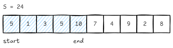 연속된 부분 합 S를 만족할 때까지 end 포인터를 증가 시킨다.