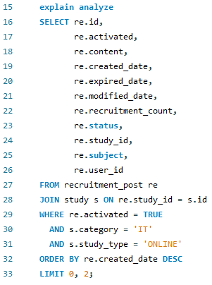 검색어를 제외한 카테고리와 스터디 타입을 고르고 2개를 찾아 오는 쿼리 입니다.