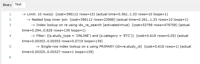 - filtered: 1 ( study_type = 'ONLINE' and category = 'IT' 조건에 맞는 row 5% )