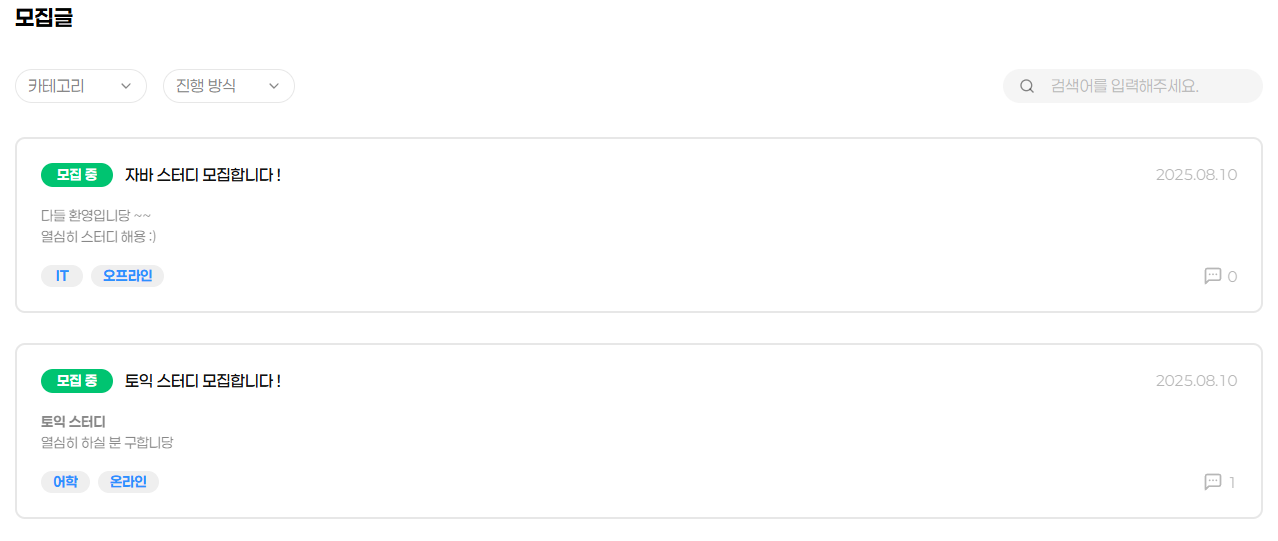 카테고리, 진행 방식, 검색어를 사용 하여 모집글을 검색할 수 있습니다.