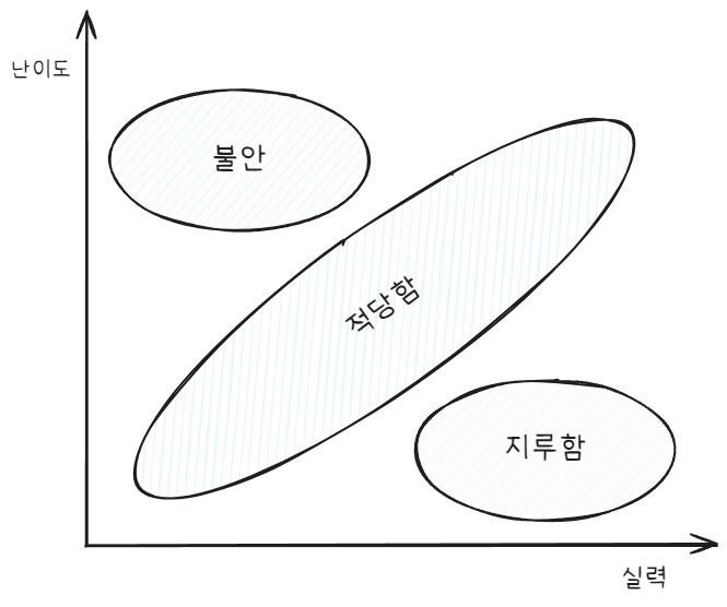 실력이 부족한데 높은 난이도 작업을 한다면 불안, 실력이 뛰어난데 쉬운 작업은 지루함을 느끼게 됩니다.