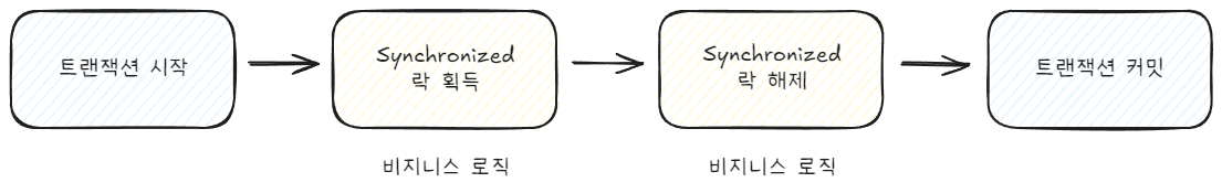 이유는 트랜잭션과 synchronized 정합성 보장 구간이 다르기 때문입니다.